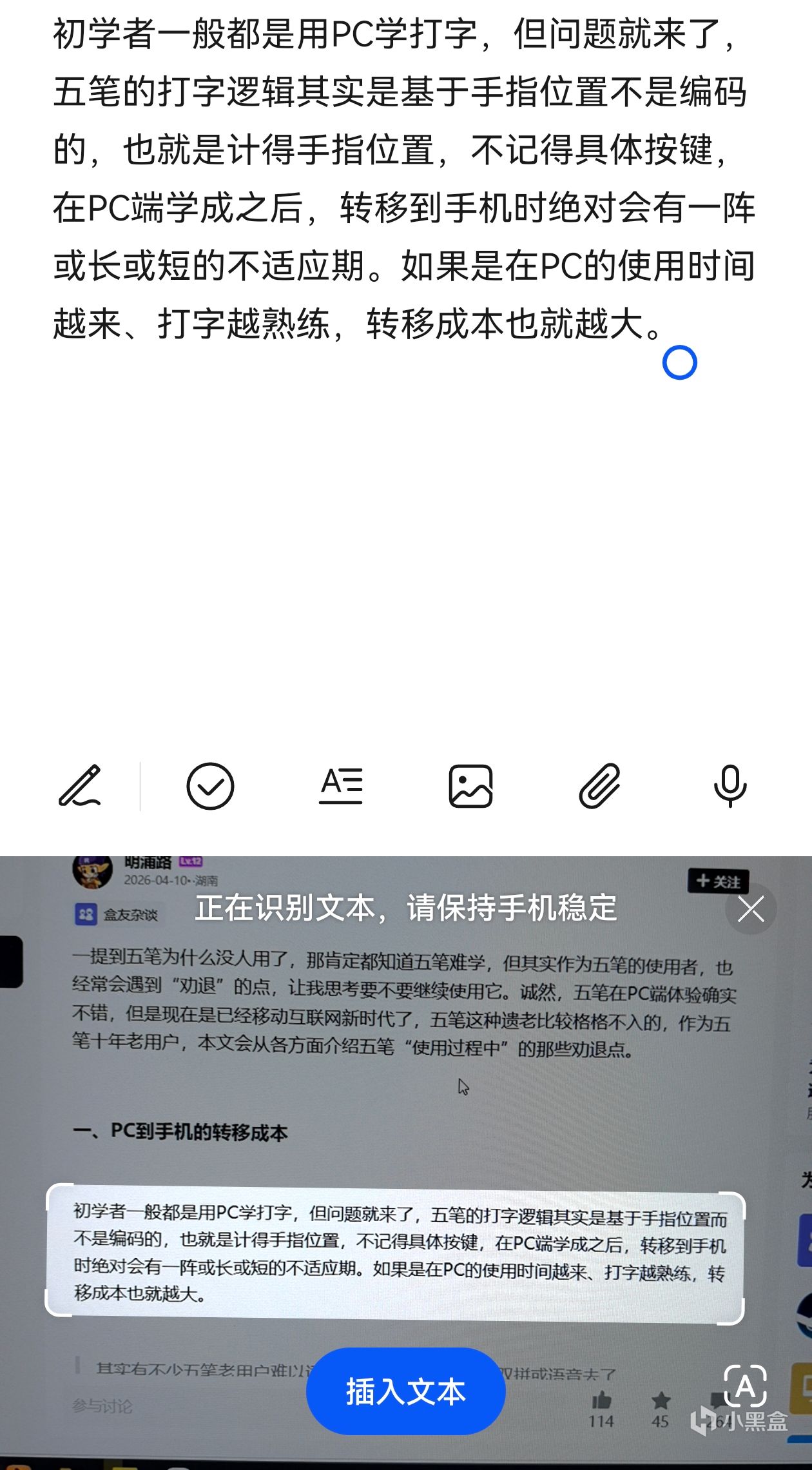 打开备忘录—>新建—>长按空白处—>拍摄输入