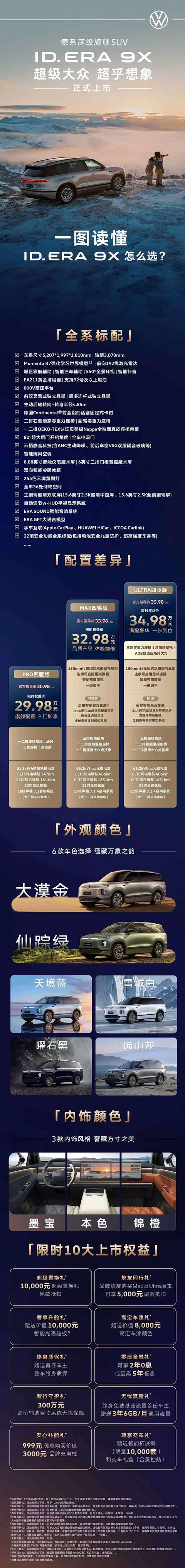 ID. ERA 9X 全系标配 EA211 增程器、双电机、后轮转向、Smart Surface 魔术屏等配置,车辆搭载宁德时代电池,CLTC 纯电续航超 400km,综合续航达到 1651km。车辆配备行云智能底盘,包含双腔空悬、DCC 电控减振与后轮转向,转弯半径 4.85m,同时具备九屏联动、零重力座椅、ANC 主动降噪等座舱配置,AEB 自动刹停速度提升至 140km/h。